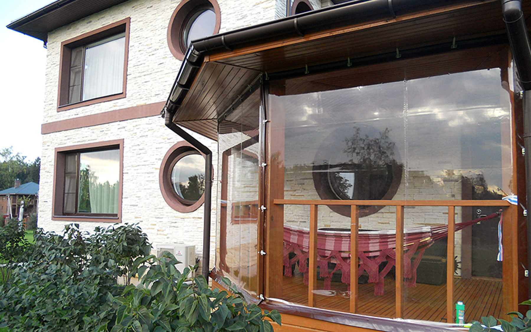 Гибкие окна используются как шторы, защищающие от ветра, дождя, насекомых и одновременно выполняют функцию отличного оформления веранды или кафе